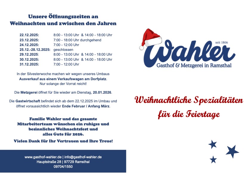 Herzlich Willkommen im Gasthof und Metzgerei „Wahler“ im idyllischen Weinort Ramsthal